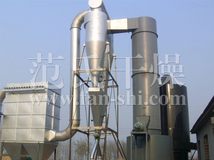 热空气由入口管以适宜的喷动速度从干燥机底部进入搅拌粉碎干燥室,对物料产生强烈的剪切、吹浮、旋转作用,于是物料受到离心、剪切、碰撞、摩擦而被微粒化,强化了传质传热。在干燥机底部,较大较湿的颗粒团在搅拌器的作用下被机械破碎,湿含量较低、颗粒度较小的颗粒被旋转气流夹带上升,在上升过程中进一步干燥。由于气固两相作旋转流动。固相惯性大于气相,固气两相间的相对速度较大,强化两相间的传质传热.所以该机生产强度高。