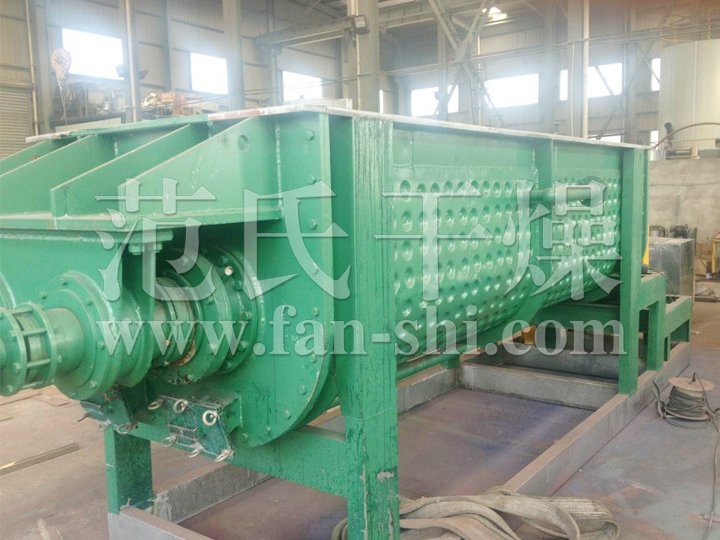 本机在夹套结构的壳体内有两根镶嵌着互相交错的桨片的平行回转轴,各轴上镶嵌有很多枚按一定间隔交错排列的中空扇形桨片,桨片有两种(进给剪切面和返回剪切面),轴低速旋转。热媒通过安装在回转轴端部的旋转接头进入中空回转轴及桨片,传热干燥后,再通过旋转接头排出机外。